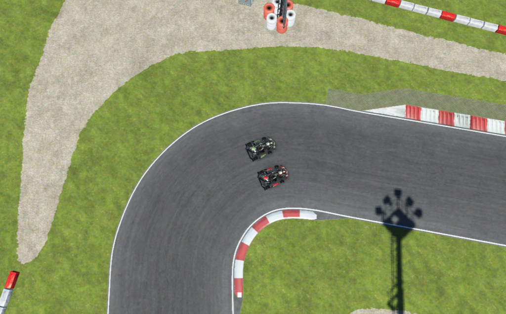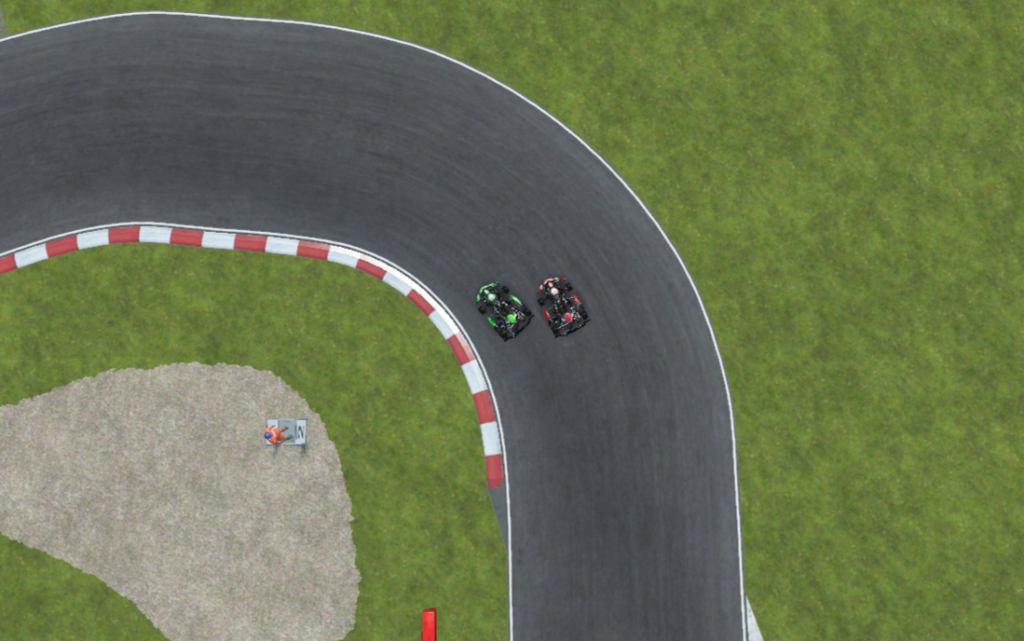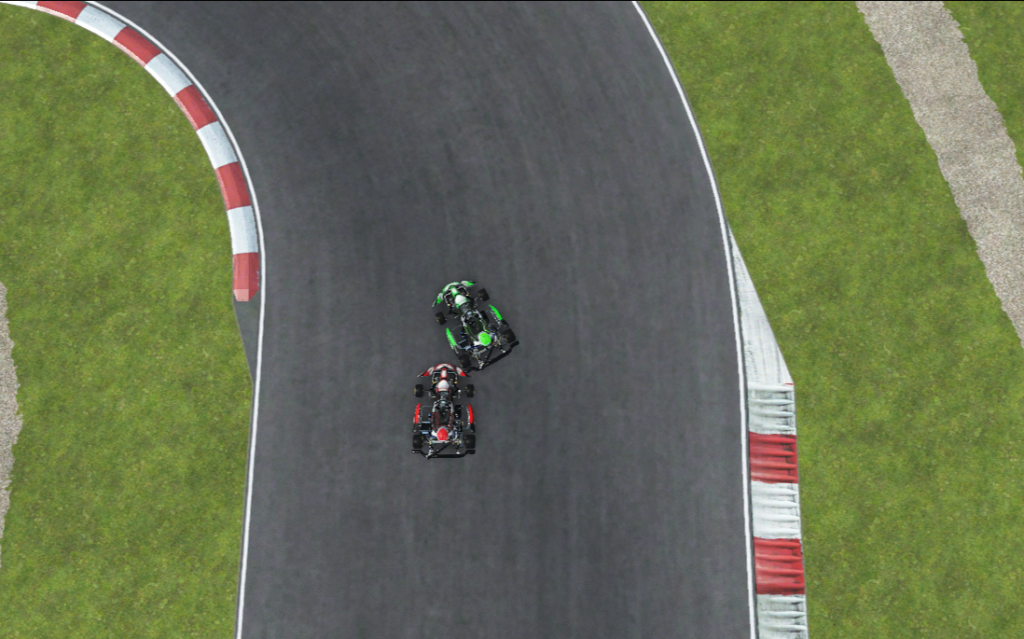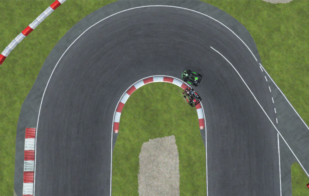 - A piros gokart a kanyart két kerékkel a belső íven levágva próbál előzési helyzetbe kerülni, félig beérni a zöld gokart mellé.