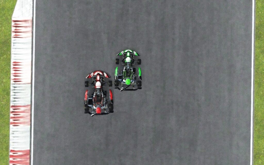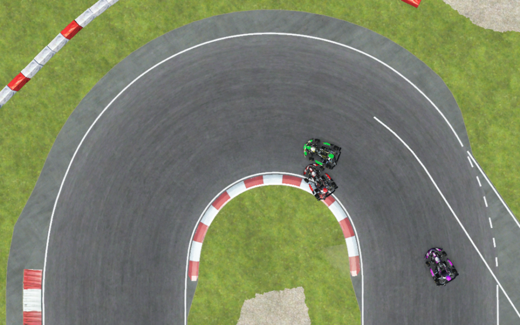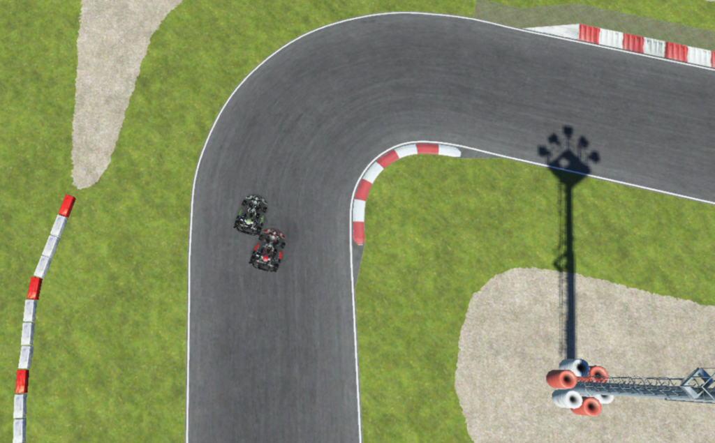 - A piros gokart a külső íven próbálja előzni a zöld gokartot.