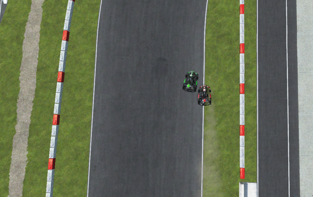 - Amikor a piros gokart bármekkora részben a zöld gokart mellé ért az egyenes szakaszon, a zöld gokartnak helyet kell hagyni a piros gokart számára ahhoz, hogy az a pályán maradjon.