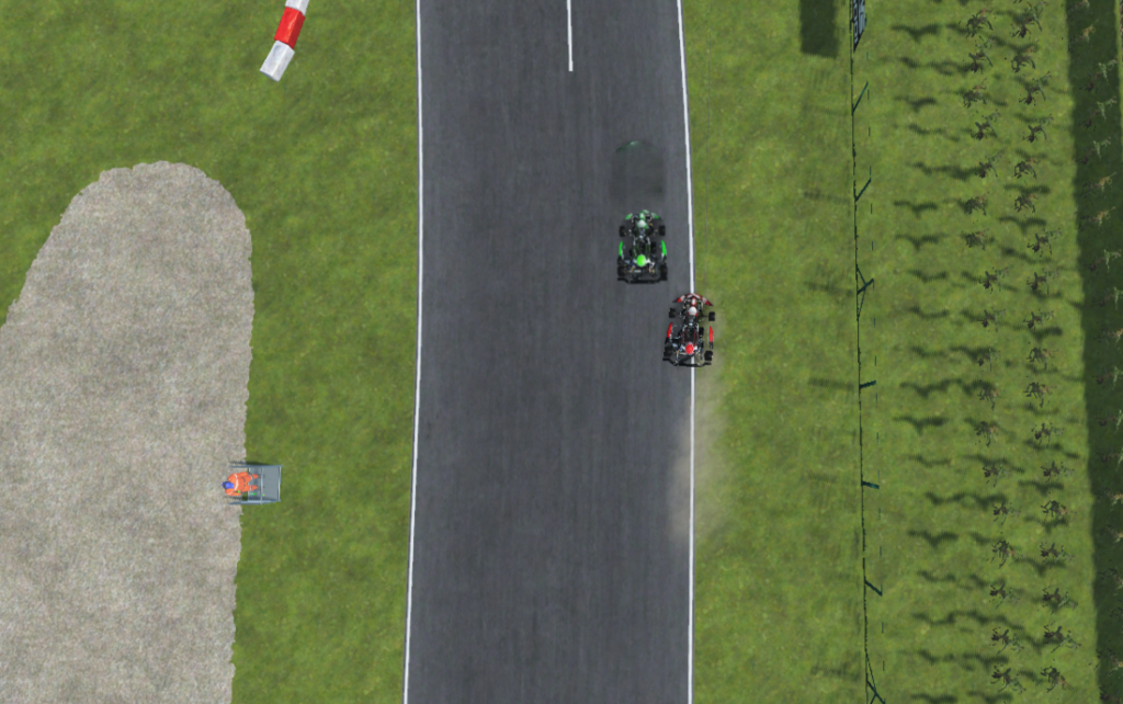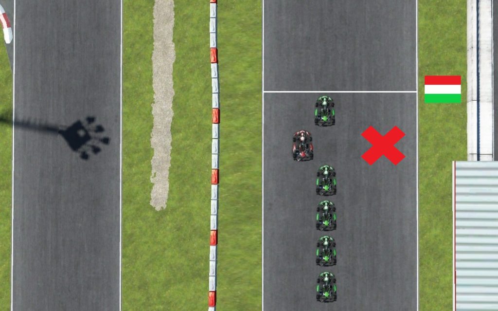 - Ha a zöld gokart a pályán kívüli területet használva előzi meg a piros gokartot, és nem leszorítás által hagyta el a pályát, az előzése érvénytelen.