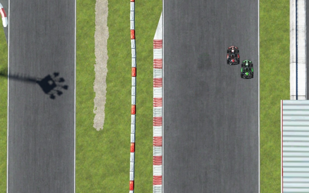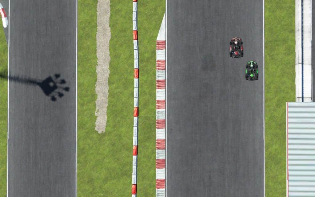 - A piros gokart előzte a zöld gokartot, de még nem ért teljesen elé.