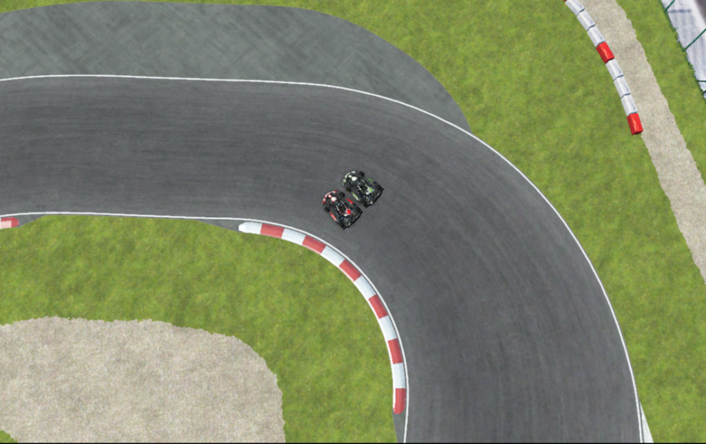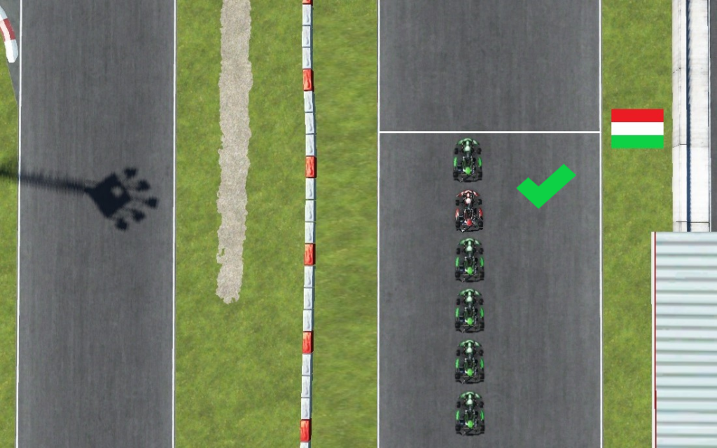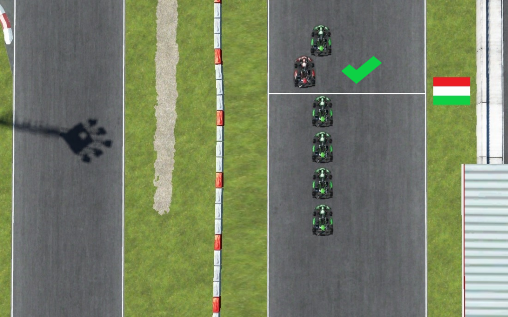 - A zöld gokart 2 irányváltást (1 védekező irányváltást és 1 visszahelyezkedést az ideális ívre) hajthat végre az egyenes szakaszon, anélkül, hogy hozzá érne a piros gokarthoz vagy leszorítaná a pályáról.
