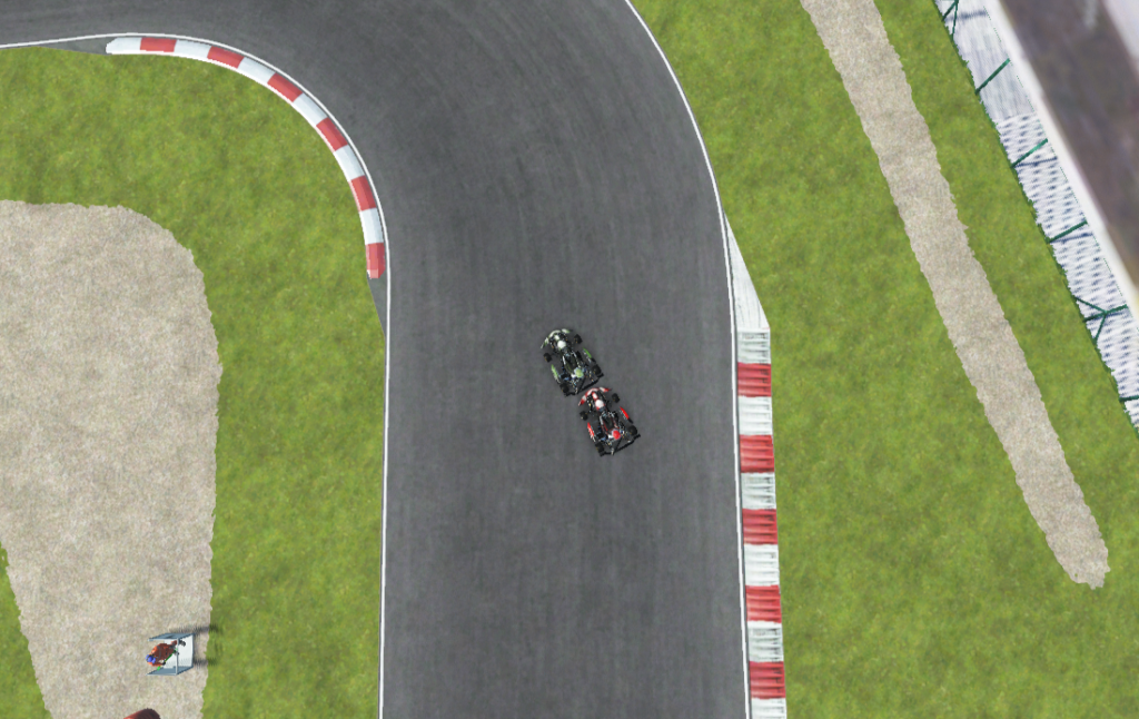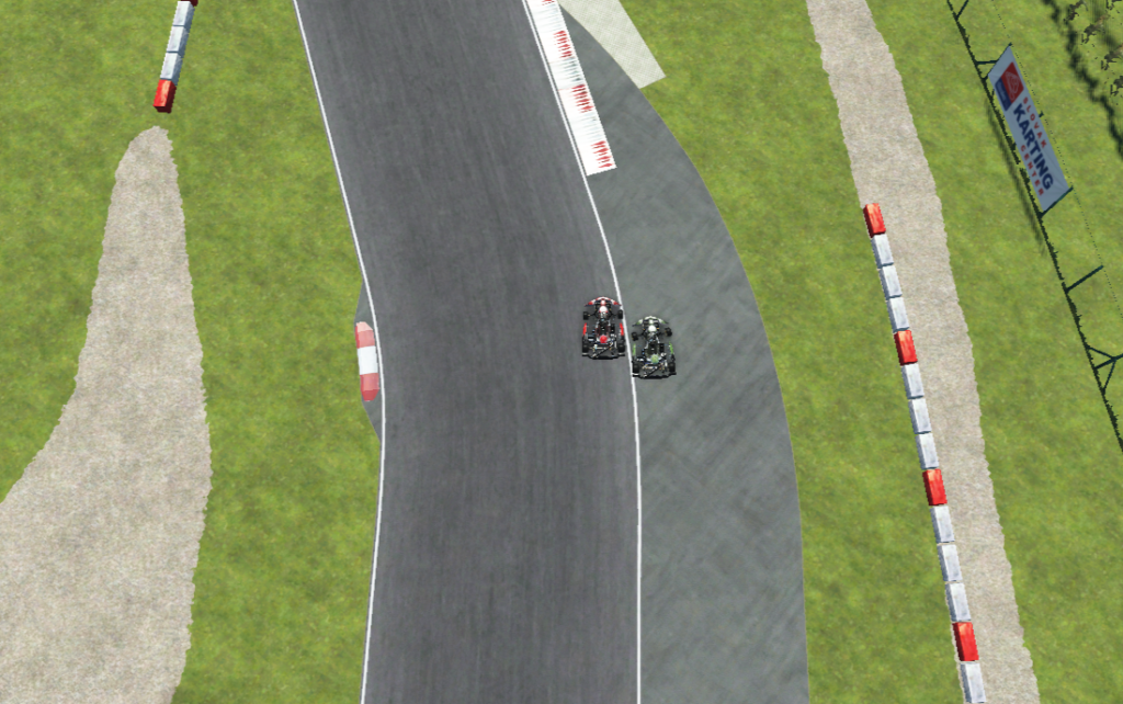 - Ha a piros gokart előzte a zöld gokartot, és a kanyar kijáratánál a zöld gokart még több, mint fél gokarttal a piros gokart mellett maradt, a piros gokartnak figyelembe kell venni a zöld gokartot, nem szoríthatja le a pályáról.