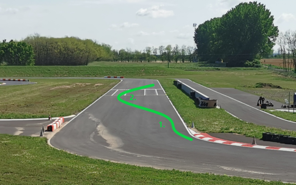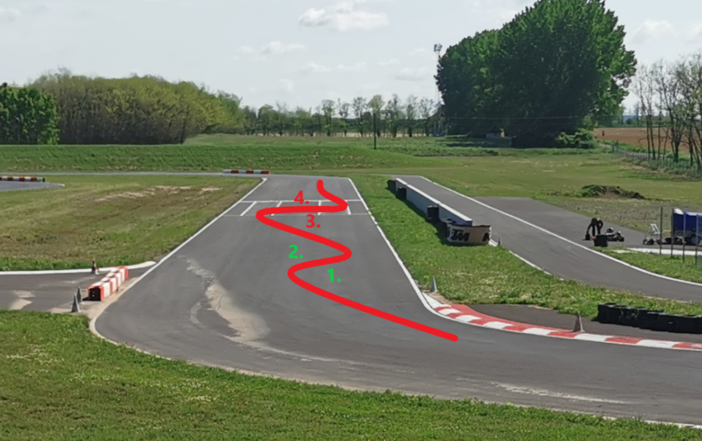 - A kanyar a piros gokarté, szabadon választhatja meg a kanyar kijárati ívét.