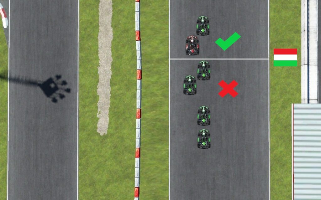 A “fél gokart” feltételére sok ponton hivatkozunk a szituációknál, ezért fontos tudni, hogy mit jelent. A szabályos előzésnek más feltételei is vannak. Más jogok illetik a versenyzőt attól függően, hogy a belső vagy a külső íven, fél gokarttal előrébb vagy hátrébb helyezkedik el.