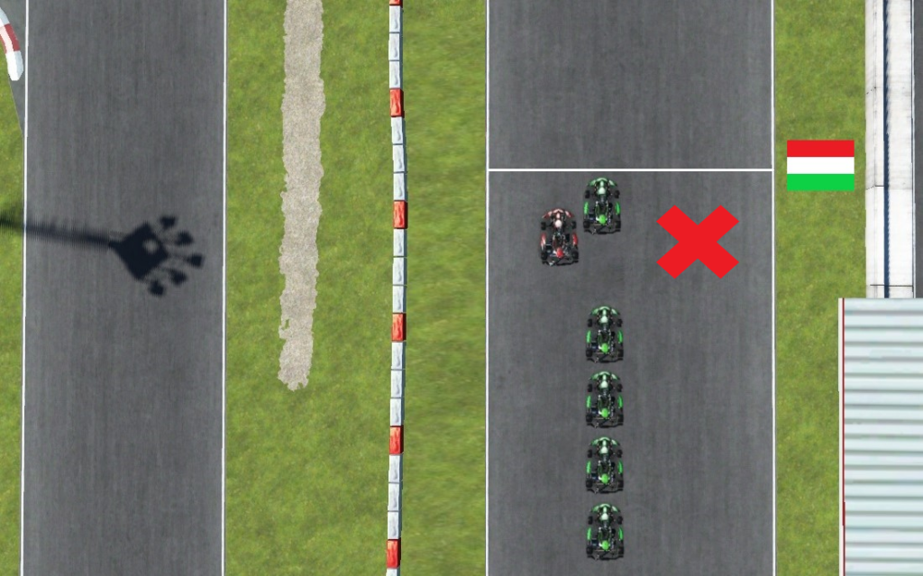 - Ha a képen látható állapot előtt a piros gokart már érintette a zöld gokartot a hátsó tengelyvonala mögött, vagy a gokart hátulját, és ezt követően ért be félig a zöld gokart mellé, a piros gokart előzése szabálytalan lesz.